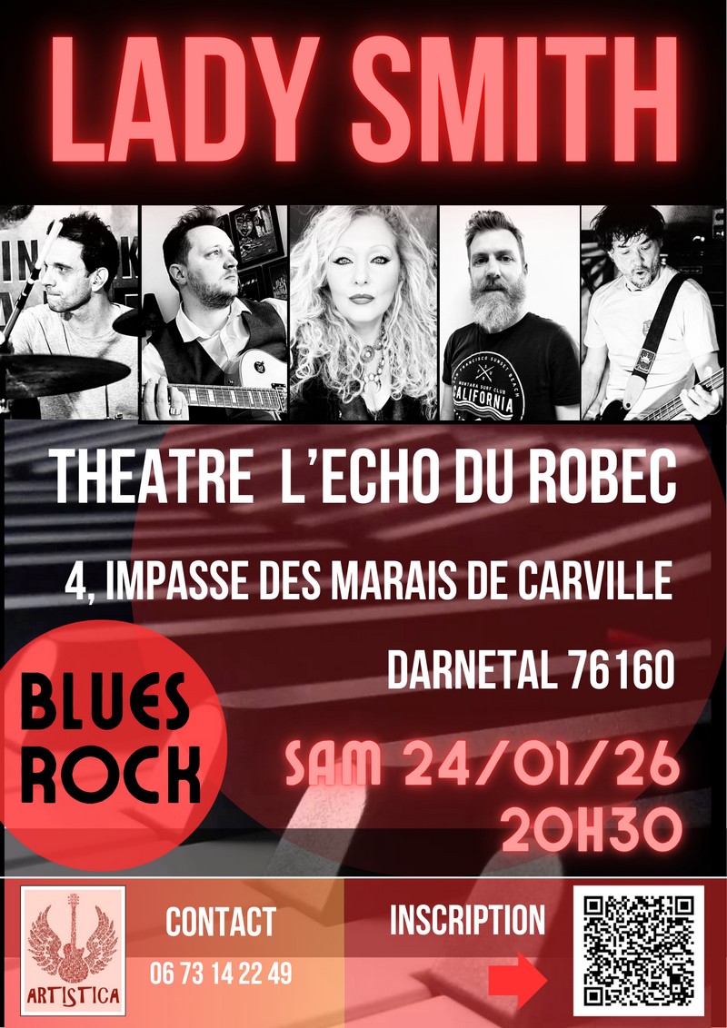 LADY SMITH – QUINTET BLUES-ROCK Galerie LADY SMITH – QUINTET BLUES-ROCK Janvier, Musique LADY SMITH – QUINTET BLUES-ROCK Samedi 24 janvier 2026 à 20h30 Cinq artistes passionnés autour d'un répertoire qui exprime les périples de la vie et les émotions humaines. LADY SMITH – QUINTET BLUES-ROCKEcho du Robec2025-11-29T02:26:55+02:00